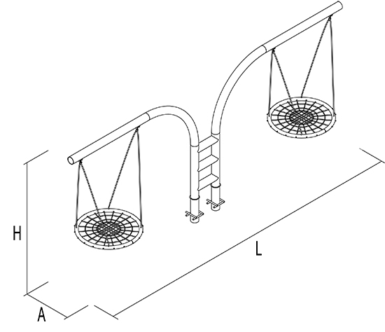 Incluye: Dos canastillas de red reforzadas Materiales: Estructura de acero tubo de 4” ced 30 y cadenas de acero galvanizado Acabado: Pintura electrostática en polvo horneada , tratamiento anticorrosivo a base de tinas de fosfatos y sellos orgánicos Medidas generales ( mm): H 1900, L5300, A951 Área de seguridad ( mm): L 7300, A 4941